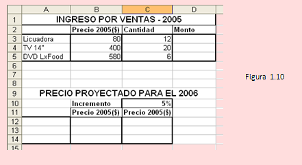 Según el problema, en C13 debiera estar la fórmula =B13*C10; sin embargo, aparece la fórmula =B13*C11. Si hace clic en C14 verá que el contenido de C14 es =B14*C12, lo que también no es correcto. Como es lógico, al avanzar una fila hacia abajo, la fórmula que se obtiene no es correcta. Las fórmulas deben ser: En C12: =B12*C10; en C13: =B13*C10 y en C14: =B14*C10. Esto nos sugiere conocer algo más sobre celdas.
