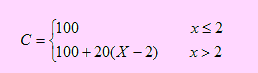Sea C la variable que representa el costo por la demora en el suministro de los materiales. De acuerdo al problema, si x 2, entonces C = 100; pero si x > 2, entonces C = 100 + 20(X – 2) ya que por cada día adicional a los dos primeros días, se tiene un costo de 20 soles. Esto no sugiere que C puede definirse de la siguiente manera