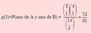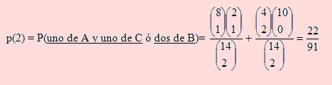 Supongamos que los productos fabricados por tres máquinas A, B y C, se juntan al final del día. Supongamos que 8 productos provienen de la máquina A, 4 de la máquina B y 2 provienen de la máquina C. Un empleado que se encarga de transportar del almacén a los camiones recibe por cada producto proveniente de la máquina A, dos soles; por cada producto proveniente de B, recibe un sol; y por cada producto de C, recibe 0 soles. Si el empleado debe transportar dos productos, encuentre la función de probabilidad de la ganancia obtenida por el empleado.