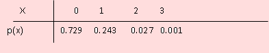 p(3) = P(X=3) = C(3,3)P(FFF) = (0.1) 3 = 0.001