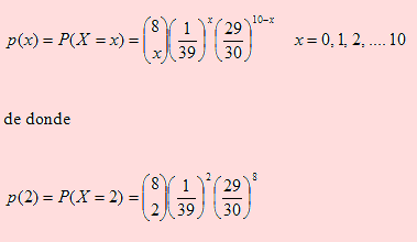 Según los datos, P(A) = p(2) = P(X = 2). Como la probabilidad de que un producto sea defectuoso es p = P(D) = 1/30, entonces, ocurre éxito cuando se extrae un artículo defectuoso, en este con p = 1/30. Ahora bien, el número de maneras de seleccionar x = 2 defectuosos en una muestra de tamaño 10 es C(10, 2). La probabilidad de que en un grupo cualquiera de estas C(10, 2) maneras haya 2 defectuosos es (1/30) 2 “y” los otros 10-2 sean no defectuosos es (29/30)8. Por ello, la función de probabilidad para x defectuosos será