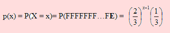 Ocurre lo mismo con X = 3. Es decir p(3) = P(X = 3) = P(FFE) = (2/3)(2/3)(1/3). Del mismo modo, X = 4 significa que p(4) = (2/3)3(1/3).