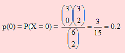 X = 0 significa que debe elegirse a dos hombres. El problema consiste ahora en elegir a dos hombres de un grupo de 3. Esto constituye una combinación de 3 elementos tomados de 2 en dos. Podríamos decir lo mismo de las mujeres: El número de maneras de elegir cero mujeres de un total de 3, representa combinaciones de 3 tomados de 0 en 0. Y como deben ocurrir los eventos “cero mujeres” y “dos hombres” entonces, la probabilidad de que ocurran será el producto de ambos, por el principio de multiplicación. El espacio muestral estará constituido por el número de combinaciones de 6 elementos tomados de 2 en dos. Por ello la probabilidad de elegir “cero” mujeres es
