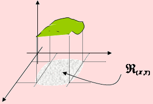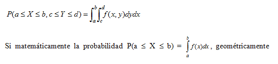 representa el área de una superficie sobre el plano cartesiano. En el caso bidimensional la probabilidad P(a ≤ X ≤ b, c ≤ Y ≤ d) geométricamente representa el volumen de una superficie en el espacio y definida por la gráfica de la curva f(x,y) y limitada por los intervalos a ≤ X ≤ b , c ≤ Y ≤ d y en el plano XY por la región ℜ(X, Y).