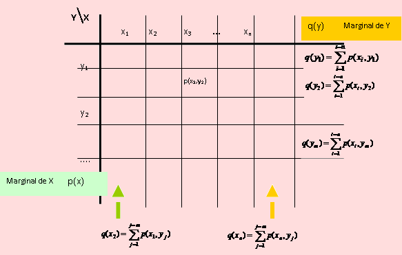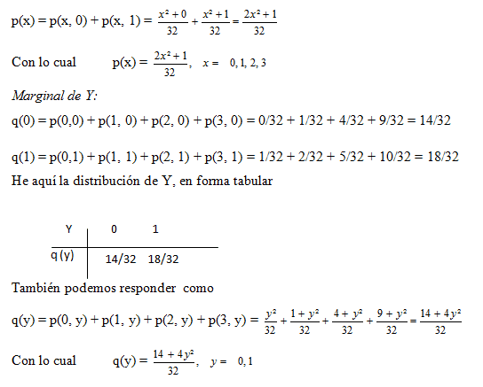 Para la Marginal de X. sólo debemos reemplazar los valores de Y, para cada valor que tome X. Igualmente, para la Marginal de Y, reemplazamos valores de X, para cada valor de Y.