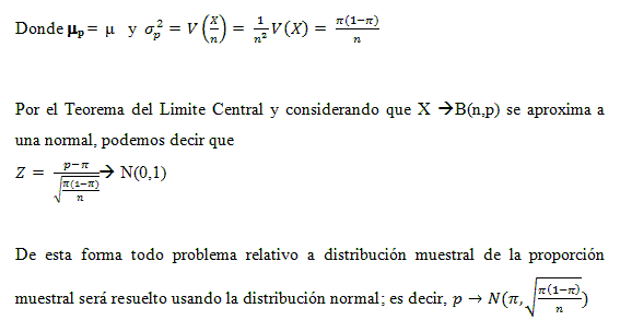 Si definimos a p = X/n como la proporción de éxitos o la proporción, diremos que p es una variable muestral cuya distribución de probabilidad viene dada por μp y σ2p .