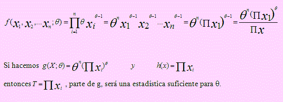 Sea X1, X2, …, Xn una muestra aleatoria extraída de una población cuya función de densidad es f(x; θ) = θxθ-1, 0 < x < 1; θ > 0. Hallar una estadística suficiente para θ.