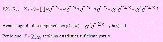 Sea X1, X2, …, Xn una muestra aleatoria extraída de una población cuya función de densidad es f(x; α) = αe-αx , 0 < x < 1; α > 0. Hallar una estadística suficiente para α.