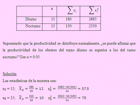 En una industria se quiere contrastar si la productividad media de los obreros del turno diurno es igual a la productividad media de los obreros del turno nocturno. Para esto se toman dos muestras, uno de cada turno, observándose la producción de cada obrero.