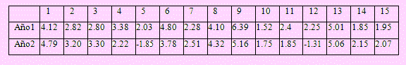Comparando el estadístico de la prueba con estos valores no se rechaza la hipótesis nula, en consecuencia podemos afirmar que no hay diferencia significativa en las utilidades por acción en los dos años.