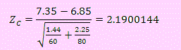 El departamento de recursos humanos de una gran empresa desea comprobar sus indicadores respecto al índice promedio de rendimiento en las ventas de su personal. Por información pasada se sabe que el índice promedio de rendimiento de los empleados que reciben un curso de capacitación es mayor al de aquellos que no asisten al curso. Además se sabe que la varianza del rendimiento de los que asisten al curso de capacitación es igual a 1.44, mientas que en aquellos que no asisten es igual a 2.25. Para comprobar si la afirmación sigue siendo cierta, se tomó una muestra aleatoria de 60 vendedores adiestrados obteniéndose un índice de rendimiento de 7.35. Por otra parte, se seleccionaron 80 vendedores no capacitados resultando un índice de 6.85. A un nivel del 5% ¿se puede afirmar que la diferencia se mantiene?