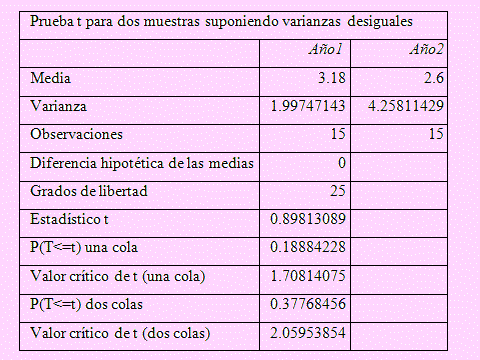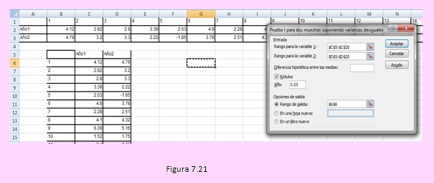 Usando la secuencia [Datos] – [Análisis de datos] – [’Prueba t para dos muestras suponiendo varianzas desiguales’] Luego de ingresa el rango para ambas variables y seleccionar la celda a partir de dónde deseamos los resultados, como se indica en la siguiente figura,