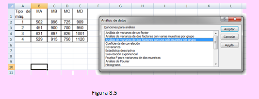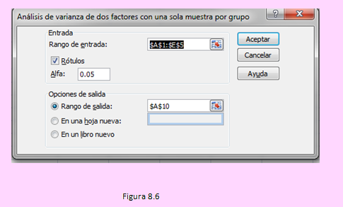 y usando la opción que se indica: Análisis de dos factores con una sola muestra, se tendrá la siguiente ventana de diálogo: