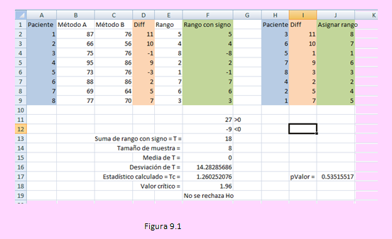 En F11 y F12 hemos sumado los rangos positivos y negativos. En F13 hemos hallado el mínimo de los valores absolutos de estas sumas. Ese es el estadístico T de la muestra.