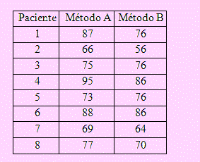 En una clínica se aplicó un determinado medicamento a un conjunto de 8 pacientes usando el método A; se repitió el tratamiento pero usando el método B. Los resultados obtenidos se muestran en el siguiente cuadro. A un nivel de significación del 5% ¿se puede afirmar que es indiferente el método a usar?