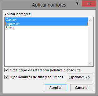 En el cuadro de diálogo Aplicar nombres que nos aparece, debemos seleccionar los nombres que queramos aplicar y hacer clic en Aceptar.