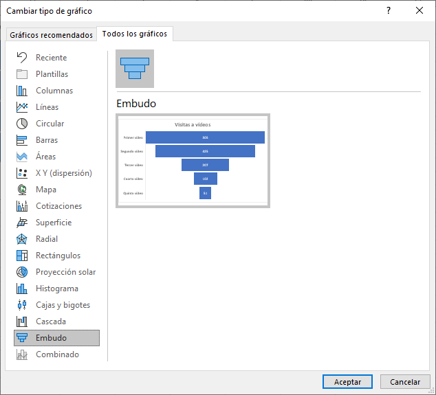 Si el gráfico de embudo no aparece recomendado también podemos insertarlo, basta pulsar en la pestaña Todos los gráficos y seleccionar Embudo.