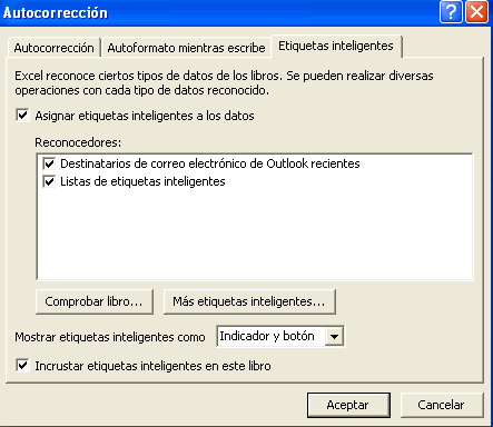 Excel2002 incorpora las Etiquetas inteligentes como novedad. Las etiquetas inteligentes permiten llevar a cabo desde Excel tareas que implicarían abrir otros programas. Un claro ejemplo de la utilidad de las Etiquetas inteligentes es el de las direcciones de correo, nosotros podemos añadir una dirección de correo electrónico al programa Outlook sin necesidad de copiar la información de Excel después abrir el Outlook y añadir el nuevo contacto. Para poder utilizar las Etiquetas inteligentes tenemos que tenerlas activadas, para ello hay que seguir estos pasos: Desplegar el menú Herramientas y seleccionar la opción Opciones de Autocorreción. Hacer clic sobre la pestaña Etiquetas Inteligentes. Activar la casilla Asignar etiquetas inteligentes a los datos. Se pueden añadir más etiquetas inteligentes a la lista pulsando en el botón Más etiquetas inteligentes, se abrirá la página web de Microsoft para que te descargues más etiquetas, por supuesto tendrás que estar conectado a Internet. |