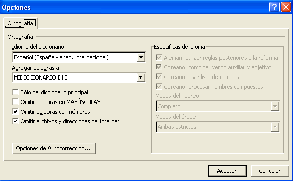 De la lista desplegable de la opción Idioma del diccionario podemos elegir el diccionario que queremos utilizar para corregir nuestro documento (Español, Inglés, Francés, etc). En la lista desplegable Agregar palabras a: elegiremos el diccionario al cual se agregarán las nuevas palabras, en el caso de querer crear un nuevo diccionario unicamente tienes que escribir el nombre del nuevo diccionario, en nuestro caso hemos creado un diccionario llamado "midiccionario". Los diccionarios se guardan con la extensión Dic como puedes apreciar. Una vez creado el diccionario pulsar Aceptar. |