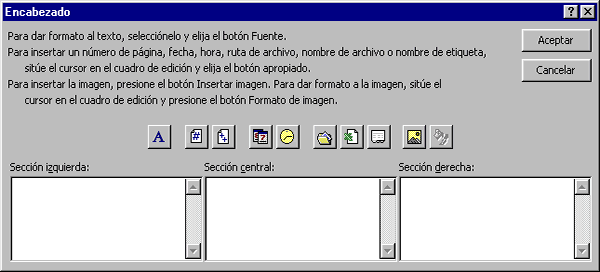Hay dos recuadros, que en nuestro caso están vacíos, ya que no hay ningún encabezado ni ningún pie de página asignado a nuestra hoja de cálculo. También nos lo indica en los recuadros con (Ninguno). Pulsando la flecha de la derecha aparecerán posibles encabezados o pies de página a utilizar. Si deseas modificar el encabezado, hacer clic sobre el botón Personalizar encabezado..., pero si deseas modificar el pie de página, hacer clic sobre el botón Personalizar pie de página... En cualquiera de los dos casos los pasos que vienen a continuación son los mismos. Aparecerá el siguiente cuadro de diálogo: Excel divide el encabezado y el pie de página en tres secciones, dependiendo de dónde queremos que aparezca el contenido del encabezado o pie de página, hacer clic en ésta y escribir el texto deseado. Existen unos botones que nos servirán para introducir unos códigos o modificar el aspecto del encabezado o pie de página. Al hacer clic sobre este botón aparece el cuadro de diálogo Fuente ya estudiado en este curso. Al hacer clic sobre este botón aparece en la sección en la que nos encontramos situados &[Página] de forma que a la hora de imprimir la hoja, aparecerá el número de página correspondiente a la hoja impresa. Al hacer clic sobre este botón aparece &[Páginas] y a la hora de imprimir saldrá el número total de páginas. Al hacer clic sobre este botón aparece &[Fecha] y en la impresión saldrá la fecha real. Al hacer clic sobre este botón aparece &[Hora] y en la impresión saldrá la hora real. Al hacer clic sobre este botón aparece [Ruta de acceso]&[Archivo] y en la impresión saldrá el nombre del libro de trabajo completo. Al hacer clic sobre este botón aparece &[Archivo] y en la impresión saldrá el nombre del libro de trabajo. Al hacer clic sobre este botón aparece &[Etiqueta] y en la impresión saldrá el nombre de la hoja impresa. Al hacer clic sobre este botón aparecerá el cuadro de diálogo para elegir la imagen a insertar y una vez elegida ésta en el recuadro del encabezado o pie de página pondrá &[Imagen] y en la impresión saldrá la imagen seleccionada. Se puede utilizar para incluir el logotipo de la empresa por ejemplo. Este botón solamente estará activo en caso de haber añadido una imagen en el encabezado o pie de página. Al hacer clic sobre este botón aparece el cuadro de diálogo Formato de imagen para poder elegir los cambios de aspecto de la imagen deseados. Realizar las modificaciones deseadas y hacer clic sobre el botón Aceptar.