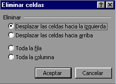Para eliminar varias celdas, seguir los siguientes pasos: Seleccionar las celdas a eliminar. Seleccionar el menú Edición y elegir la opción Eliminar... Aparecerá el cuadro de diálogo de la derecha. Elegir la opción deseada dependiendo de cómo queremos que se realice la eliminación de celdas. Desplazando las celdas hacia la izquierda o hacia la derecha. Observa como desde aquí también te permite eliminar filas o columnas enteras. Hacer clic sobre Aceptar. |