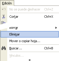 Para eliminar una hoja, seguir los siguientes pasos: Situarse en la hoja a eliminar. Seleccionar el menú Edición. Situarse sobre el botón para que se amplíe el menú. Eligir la opción Eliminar hoja. |