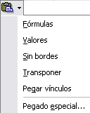 Fórmulas: Para copiar únicamente la fórmula de la celda pero no el formato de ésta. Valores: Para copiar el resultado de una celda pero no la fórmula, como tampoco el formato. Formatos: Para copiar únicamente el formato de la celda pero no el contenido. Comentarios: Para copiar comentarios asignados a las celdas (no estudiado en este curso). Validación: Para pegar las reglas de validación de las celdas copiadas (no estudiado en este curso). Todo excepto bordes: Para copiar las fórmulas así como todos los formatos excepto bordes. Ancho de columnas: Para copiar la anchura de la columna. Formato de números y fórmulas: Para copiar únicamente las fórmulas y todas los opciones de formato de números de las celdas seleccionadas. Formato de números y valores: Para copiar únicamente los valores y todas los opciones de formato de números de las celdas seleccionadas. |