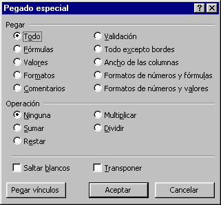 Aparecerá el cuadro de diálogo Pegado especial en el que tendrás que activar las opciones que se adapten al pegado que quieras realizar: |