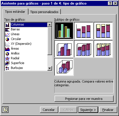 En la ficha Tipos estándar tenemos los tipos más comunes y también tenemos más tipos de gráficos en la ficha Tipos personalizados. Una vez elegido el tipo de gráfico, en el recuadro de la derecha, elegir un subtipo. En la parte inferior del recuadro aparece una breve descripción de éste. Si pulsas sobre el botón Presionar para ver muestra y lo mantienes pulsado, aparece en lugar de los subtipos, una muestra de nuestro gráfico según los datos seleccionados. En todos los pasos del asistente se dispone de varios botones en la parte inferior del cuadro de diálogo, hacer clic sobre el botón deseado: Cancelar para no realizar el gráfico. Atrás para ir al paso anterior del asistente. Si estamos en el primer paso este botón aparecerá desactivado ya que no tiene sentido. Siguiente para ir al paso siguiente del asistente. Si estamos en el último paso, este botón no tendrá sentido. Finalizar para salir del asistente, pero creando el gráfico con todas las opciones que tiene por defecto. |