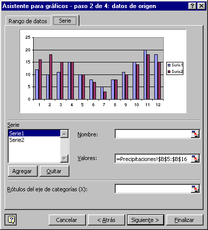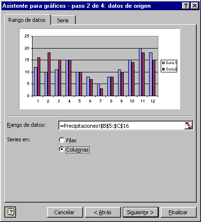Este paso es el más importante de todos ya que en él definiremos qué datos queremos que aparezcan en el gráfico. Dispone de dos fichas: En el recuadro Rango