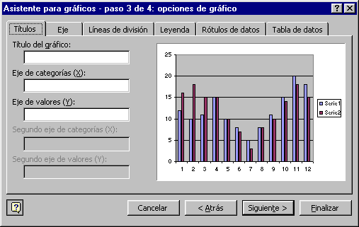 Aparecerá el tercer paso del asistente para gráficos, el cuadro de diálogo OPCIONES DE GRÁFICO, que consta de seis fichas para especificar detalles sobre el aspecto del gráfico. Algunas opciones pueden variar dependiendo del tipo de gráfico.