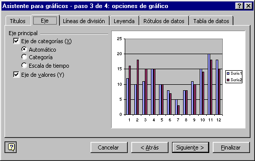 En la primera ficha Títulos, escribir en el recuadro Título del gráfico: el nombre que deseamos que aparezca en la parte superior de éste. Escribir en el recuadro Eje de categorías el título que le queremos asignar al eje de abscisas (X) (eje horizontal). Escribir en el recuadro Eje de valores el título que le queremos asignar al eje de ordenada (Y) (eje vertical). Hacer clic sobre la ficha Eje, para seguir con las opciones del gráfico. |