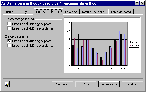 Las líneas de división son líneas horizontales o verticales que ayudan a clarificar la posición de los marcadores de datos respecto a las escalas de los ejes. Las líneas de división principales parten de unas subdivisiones del eje denominadas marcas de graduación principales. Las líneas de división secundarias parten de subdivisiones menores denominadas marcas de graduación secundarias. Por ejemplo en el gráfico inferior tenemos activadas las líneas de división principales del eje Y, por eso nos aparecen las líneas horizontales en los valores 5, 10, 15, 20 y 25 (marcas de graduación principales), estas líneas nos permiten evaluar mejor qué valores están asociados a cada serie en cada valor de la X.