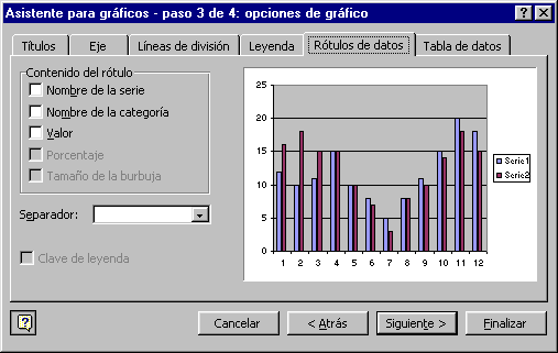 El asistente para gráficos permite asociar distintos tipos de rótulos a los marcadores de datos, el marcador de datos es el punto de intersección entre un valor X y un valor Y. Por ejemplo si activamos la casilla valor aparecerá encima de cada barra el valor representado. |