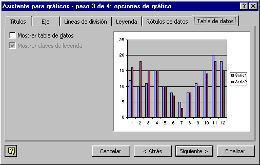 Dependiendo del tipo de gráfico que se esté creando, Excel2002 puede darte la opción de incluir una tabla de datos junto con el gráfico. Una tabla de datos es una tabla con los valores representados en el gráfico.