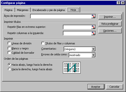 En Área de impresión: podrás indicar qué rango de celdas quieres imprimir. En Imprimir títulos podrás activar cualquiera de las siguientes opciones: Repetir filas en extremo superior para que en cada página que se imprima aparezca como título de columnas aquella fila que está indicada en ese recuadro. Repetir columnas a la izquierda para que en cada página que se imprima aparezca como título de la fila aquella columna indicada en el recuadro. En el recuadro Imprimir podrás activar cualquiera de las siguientes opciones: Líneas de división para imprimir las líneas que delimitan cada celda de la hoja. Blanco y negro por si tenemos asignados colores en nuestra hoja y vamos a utilizar una impresora en blanco y negro o no queremos gastar el cartucho de colores. Calidad de borrador para realizar una impresión rápida pero menos bonita de nuestra hoja. Sólo tendrá sentido si la impresora dispone de esta herramienta. Títulos de filas y columnas para imprimir los encabezados de filas (los números de filas de la izquierda) y columnas (las letras de los nombres de las columnas superiores) de la hoja. |