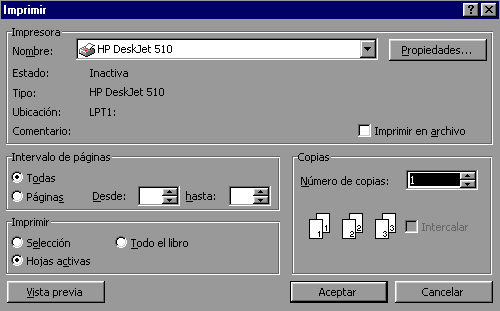 | En el recuadro Intervalo de páginas, tendremos que indicar si deseamos imprimir Todas las páginas, o bien sólo un rango de Páginas, especificándolo en Desde: y hasta: En el recuadro Imprimir, podrás indicar si deseas imprimir Todo el libro, o sólo las Hojas activas (seleccionadas o nuestra hoja activa), o bien, Selección para imprimir sólo los objetos seleccionados de la hoja. Por último en Número de copias: podrás indicar el número de copias a realizar y si las quieres Intercalar. |