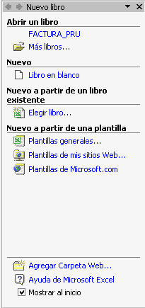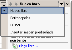 Este elemento no existía en la versión anterior de Excel. El panel de tareas es sensible al contexto, esto quiere decir que mostrará información diferente según lo que estemos haciendo en el momento de abrirlo. Por ejemplo, en la imagen de la página anterior hemos abierto una hoja nueva y el panel de tareas que aparece es "Nuevo libro" que nos ofrece los comandos más útiles para esa situación: nos muestra las hojas recientemente abiertas; nos permite crear una nueva hoja a partir de una plantilla, etc. Si estamos insertando una imagen, el panel de tareas será diferente y nos mostrará las opciones más usuales en el trabajo con imágenes. En la primera línea del panel de tareas aparecece el título del panel, en este ejemplo el título es "Nuevo libro". Hay disponibles otros tres paneles de