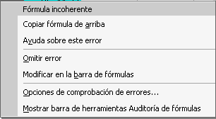 Si no sabemos qué hacer, disponemos de la opción Ayuda sobre este error. Si lo que queremos es comprobar la fórmula para saber si hay que modificarla o no podríamos utilizar la opción Modificar en la barra de fórmulas. Si la fórmula es correcta, se utilizará la opción Omitir error para que desaparezca el símbolo de la esquina de la celda. |