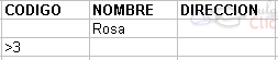 Cuando la condición es una igualdad no es necesario poner el signo = delante del valor, ponemos directamente el valor Rosa, ahora si quisiéramos los registros cuyo código sea superior a 3 deberíamos escribir en la celda inferior a la cabecera CODIGO, >3 para formar la condición Codigo > 3.