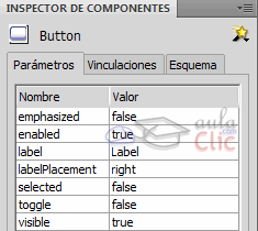 - icon: Añade un icono al botón. Para insertar un icono deberemos crear un gráfico o clip de película y guardarlo en la Biblioteca. Una vez allí lo seleccionamos y haciendo clic derecho sobre él, seleccionamos Vinculación. Marcamos la casilla Exportar para ActionScript en el cuadro de diálogo que aparecerá y le damos un nombre en Identificador. Este nombre es el que deberemos escribir en el campo icon del componente botón. Ni el botón ni el símbolo se ajustará al tamaño del otro, así que deberemos modificar sus tamaños para que el icono no sobresalga del botón.