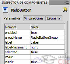 - groupName: Nombre del grupo. En un grupo de botones de opción sólo uno de ello puede estar seleccionado. Definiremos este grupo mediante esta propiedad. Todos los botones que tengan el mismo nombre en groupName pertenecerán al mismo grupo.