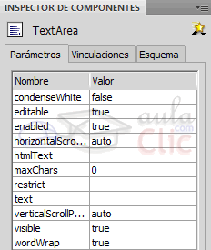 - wordWrap: true o false. Permite que se pueda realizar un desplazamiento del texto de arriba abajo. En caso de que no se permita (false) cuando el texto sobre pase el área del componente aparecerá una barra de desplazamiento que permitirá mover el texto de izquierda a derecha.