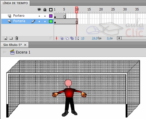 Siguiendo con el ejemplo del portero, si quisiéramos crear un movimiento que haga que el portero se desplace hacia un lado no hay ningún inconveniente, pero si la portería estuviera en la misma capa que el portero, entonces ambos objetos se moverían hacia dicho lado, con lo que resultaría imposible que sólo se moviera el portero. La solución es separar los objetos en 2 capas, como ya hemos hecho.