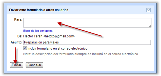 Haciendo clic sobre el botón Enviar este formulario por correo electrónico ubicado en la parte superior derecha, e indicando las direcciones tal como se muestra a continuación.
