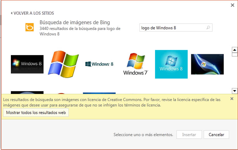 Nota: Por lo general Bing muestra imágenes con licencia Creative Commons, si desea obtener más resultados, haga clic en el botón Mostrar todos los resultados web.