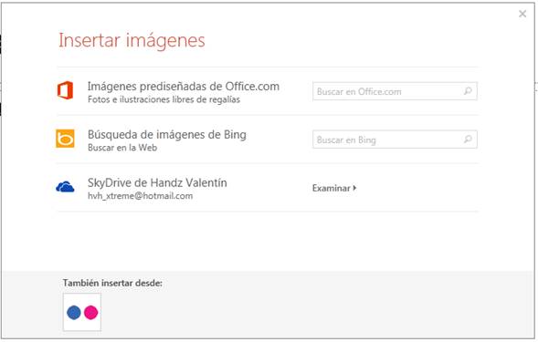 También puede insertar una imagen que puede buscar desde Bing, un servicio de búsqueda web que posee Microsoft. Use el campo Búsqueda de imágenes de Big y escriba un texto que coincida con lo que desea buscar y pulse Enter. Seleccione una o varias imágenes si es necesario y clic en Insertar.