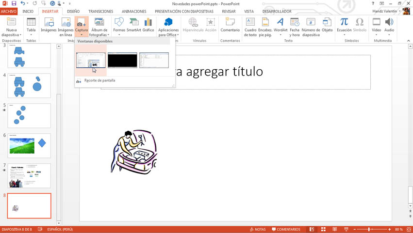 En esta nueva versión de Office se puede capturar pantallas sin necesidad de la tecla Print Screen (Impr Pant). Con el nuevo comando para capturar pantalla puede capturar una ventana completa o parte de ella.