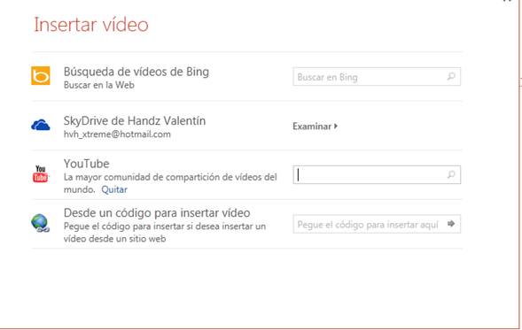 PowerPoint 2013 ahora puede insertar vídeos de diferentes fuentes. Cuando hace clic en la ficha Insertar, en el grupo Multimedia, haciendo clic en Vídeo y luego Vídeo en línea, usted abrirá la ventana de diálogo Insertar vídeo y desde ahí podrá usar alguna de las opciones para insertar un vídeo desde Internet o incrustarlo en su presentación mediante un código embebido.