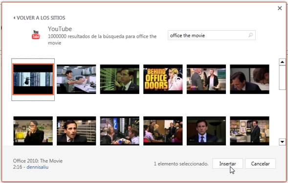 Por ejemplo, e la opción YouTube puede escribir un texto que coincida con el vídeo que desea buscar y pulse Enter. Automáticamente se cargarán los resultados de los vídeos coincidentes. Haga clic en uno de ellos y luego clic en Insertar.